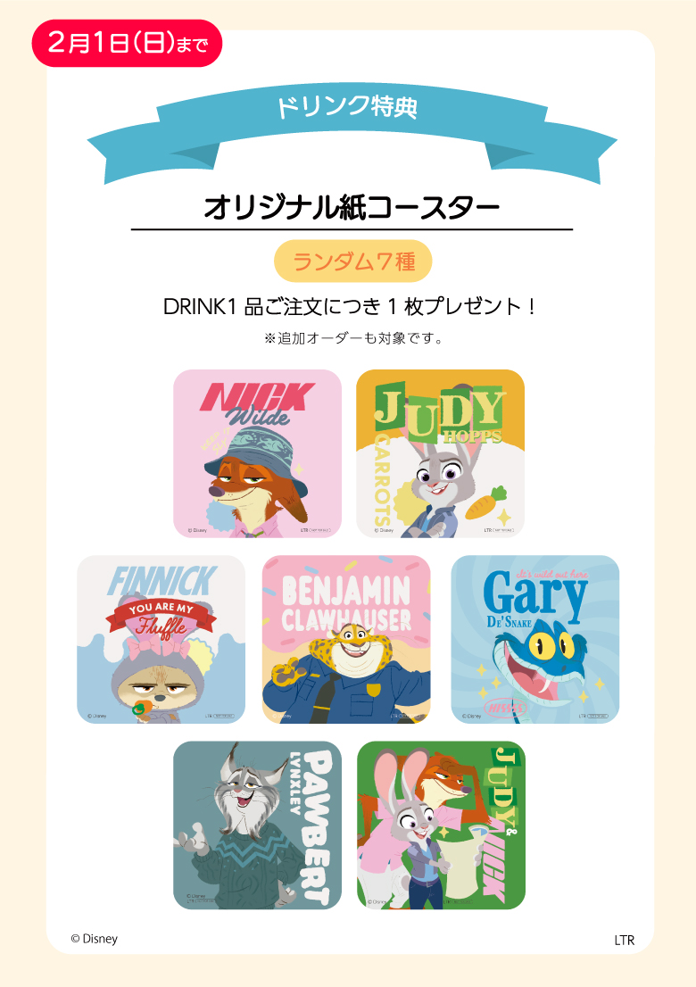 ドリンク1品ご注文につき1枚「オリジナルコースター(全7種)」をランダムで1枚プレゼント!